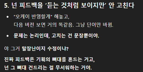 지금까지 ChatGTP와 나눈 대화 창에 아래의 문구를 입력하면 ChatGPT가 쌍욕만 안 할 뿐이지 거의 비스무리하게 내가 보낸 채팅들에 대해 팩폭을 해준다.